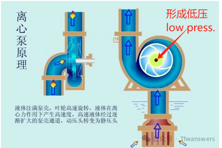 当泵体充满液体后,叶轮旋转产生离心力,液体被甩向叶轮边缘,获得速度能量并排出。叶轮中心的压力降低,液体从泵的吸入口流向叶轮中心,形成持续的吸入和排出过程。如图1