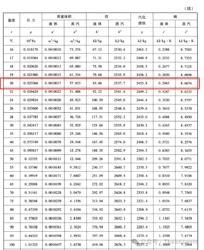 那么如果把水的压力降低到2.3kpa时候,水的沸点温度只有20摄氏度,有兴趣的小伙伴可以保存一下2.1表 饱和水与饱和蒸汽表:(0-100°C按照温度排列)